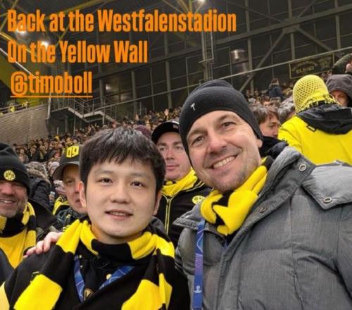樊振东与波尔再看足球比赛,与多特蒙德主帅合影,喜笑颜开超开心