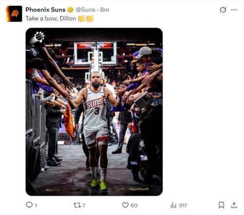40+8迎生涯之夜!太阳官方为狄龙鼓掌美记:彻底改变凤凰城文化